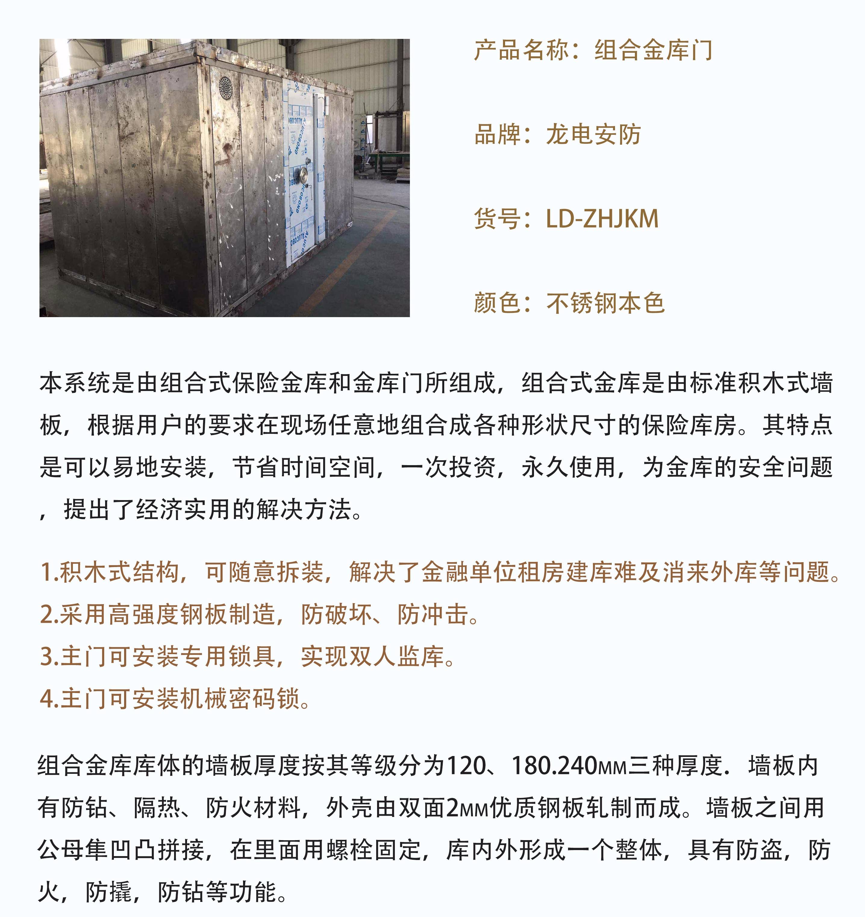 本產(chǎn)品其基本結構為帶有防鉆、防火焰切割功能的龍電特種合金保護的門(mén)扇、門(mén)框及日閘門(mén),有一把美國UL認證的LG機械密碼鎖,一把防盜鎖。輕松靈活的執行機構,外表面不銹鋼包覆層。本產(chǎn)品達到中華人民共和國公共安全行業(yè)標準及國際防盜、防火等級標準。